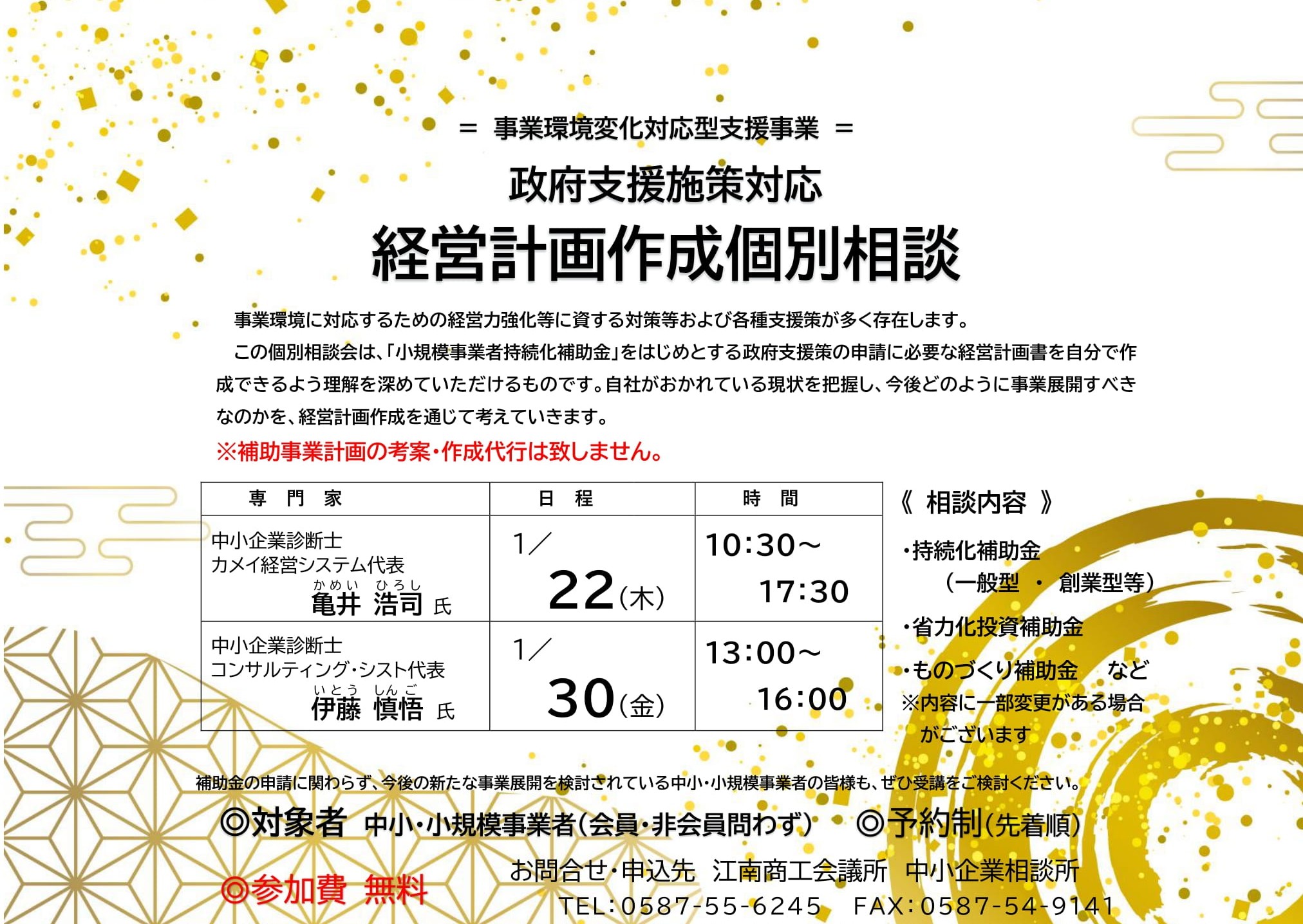 事業環境に対応するための経営力強化等に資する対策等および各種支援策が多く存在します。この個別相談会は、「小規模事業者持続化補助金」をはじめとする各種コロナ支援施策の申請に必要な経営計画書を自分で作成できるよう理解を深めていただけるものです。コロナとの共存の中でも事業の継続が可能となるよう、自社がおかれている現状を把握し、今後どのように事業展開すべきなのかを、経営計画作成を通じて考えていきます。