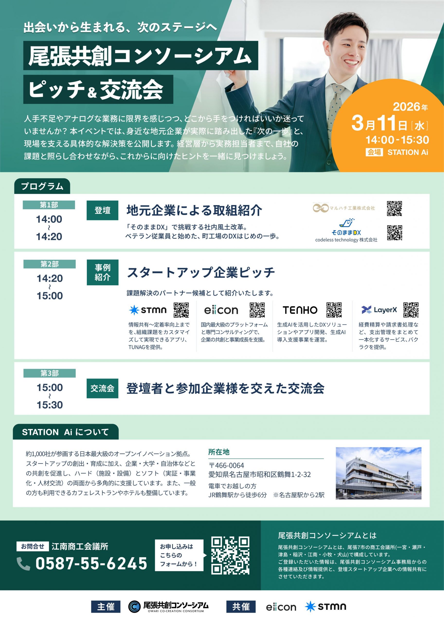 尾張共創コンソーシアム※では、スタートアップとの連携を促進するため、愛知県が運営するオープンイノベーション拠点「STATION Ai」を活用した取組みを進めています。今回は「次の一歩(面談・検討)」と「共創への関心」につなげることを目的に、スタートアップ社登壇によるピッチイベント&交流会を開催します。スタートアップ社との共創やオープンイノベーションにご関心のある企業の皆様のご参加を、心よりお待ちしております。